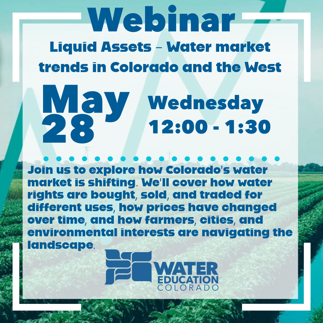 Join us on May 28 to explore water market trends. We'll look at how water rights are bought, sold and traded for different uses; how prices have changed over time; how farmers, cities, environmental interests and others are navigating a shifting water market; and we'll hear various perspectives on the opportunities and challenges with Colorado's market.