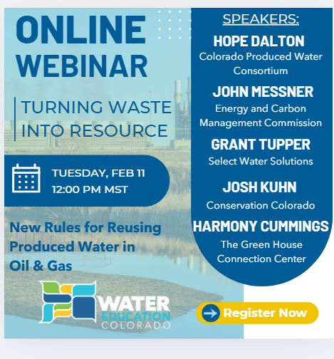 Join us on February 11 at noon for a webinar on produced water where we'll start with some basics about water in the oil and gas industry. We'll learn what to expect from those new rules, hear about the Colorado Produced Water Consortium, and explore opportunities and challenges from the industry and environmental perspectives.