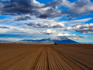 Planting rye after potatoes on Nissen Farms in the San Luis Valley’s Mosca, Colo., with the Great Sand Dunes in background on Oct. 21, 2021. (Erin Nissen)