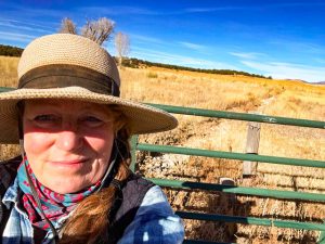 Bowen Ditch Company secretary Tara Flanagan at the corner of her land, where the channel crosses to the south. (Tara Flanagan)