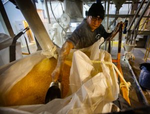 David Pettigrew, with the Ute Mountain Ute Bow & Arrow Brand cornmeal mill, fills a bag with ground corn at the mill near Towaoc, Colo., on Oct. 20, 2021. (Jerry McBride/Durango Herald)