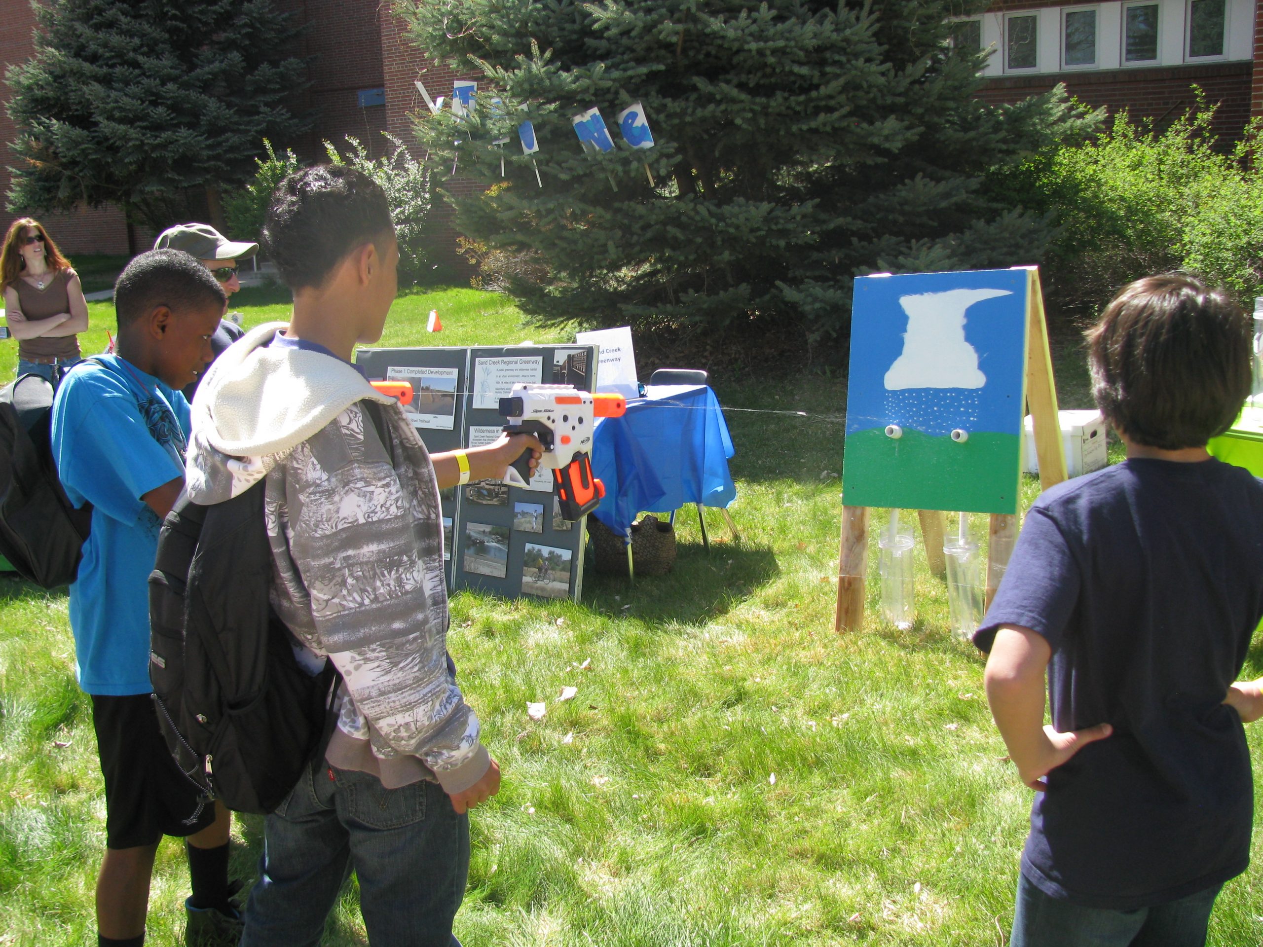 - Students play “Make it Rain” shooting water guns at a target and measuring their results with a rain gauge