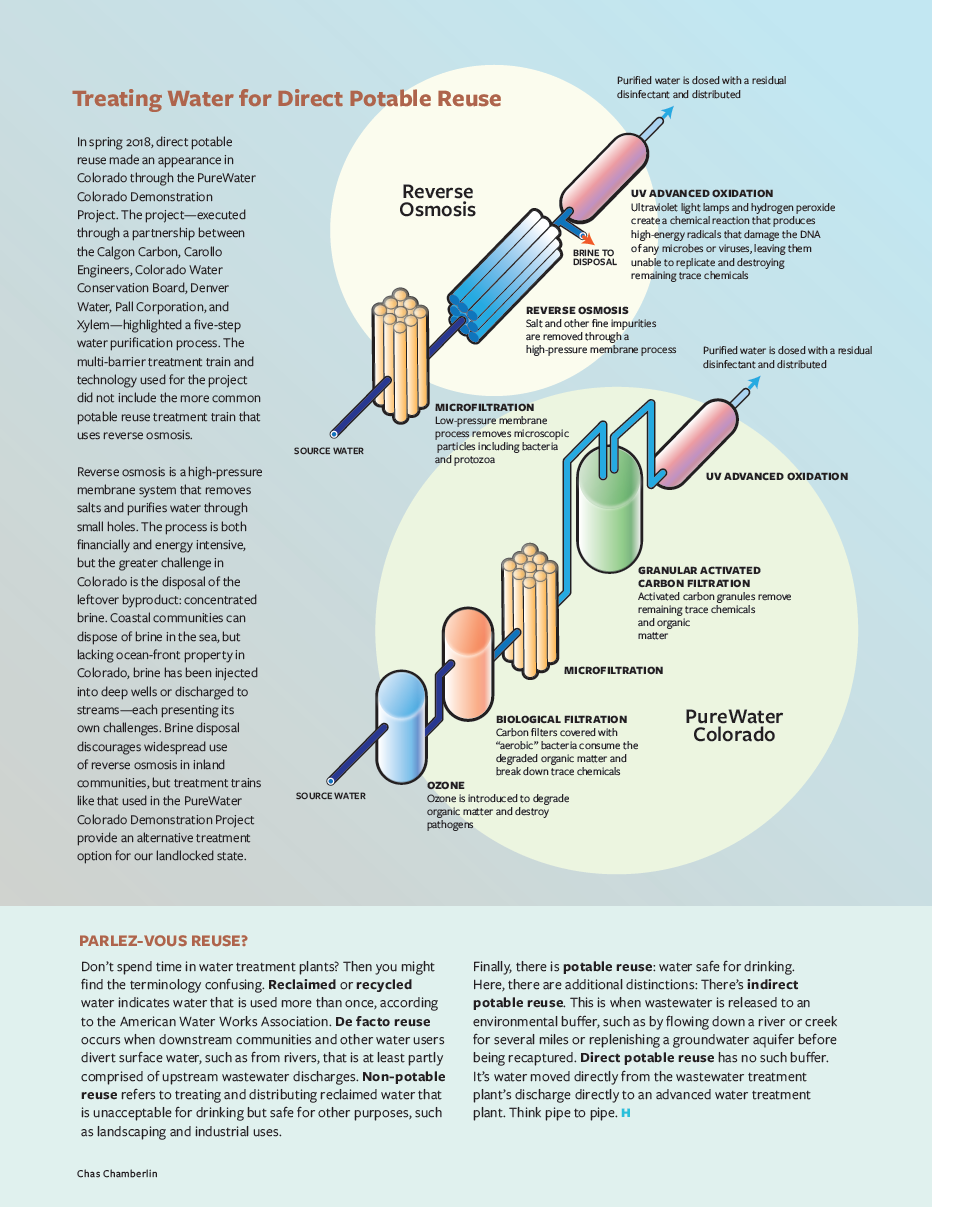 Now, Colorado and several other water-stressed states are moving cautiously but deliberately toward direct potable reuse. “Widespread development of potable reuse will be an important facet of closing the future water supply-demand gap,” said the Colorado Water Plan of 2015.