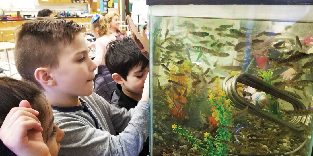 Children check on the juvenile fish they’re raising through Trout in the Classroom, a program by Trout Unlimited to connect youth to fishing education.