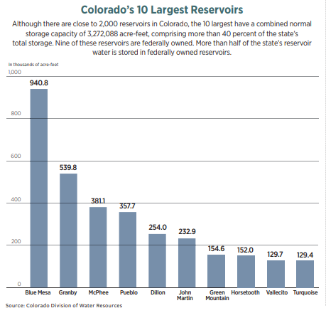 Colorado boasts above-ground reservoirs and below-ground aquifer storage; reservoirs that are owned and managed by a single entity and others that are shared; storage that meets the needs of municipalities, farmers, the environment and recreation. It also has dams that serve as flood control and others that hold back water to release later to downstream states. There is storage to enable water reuse and recycling; storage that facilitates water sharing; storage as an important logistic in water treatment; and storage as a waiting place before or after water is used to generate hydropower. There are reservoirs to hold more than 940,000 acre-feet and others that hold less than 1 acre-foot. There are natural lakes used to store water, and an order of magnitude more manmade reservoirs.