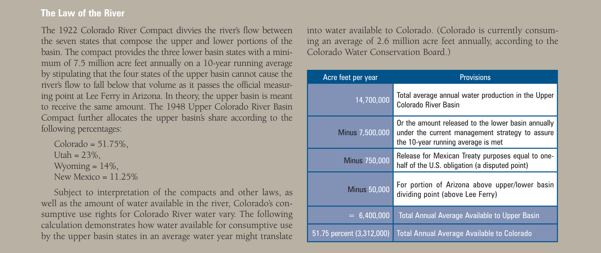 Under the 1922 Colorado River Compact, the seven states that comprise the basin must share its water. At the time the compact was signed, the river’s average annual flow was thought to be 17.5 million acre feet (maf). The three lower basin states—Nevada, Arizona and California—were allotted 7.5 maf per year, and the four upper basin states—Wyoming, Utah, Colorado and New Mexico—expected to receive the same amount. The compact requires, however, that a flow condition be met at Lee Ferry in Arizona, the dividing line between the upper and lower basins—75 maf over a 10-year running average—resulting in the upper basin bearing the impact of shortage created under lower flow conditions.