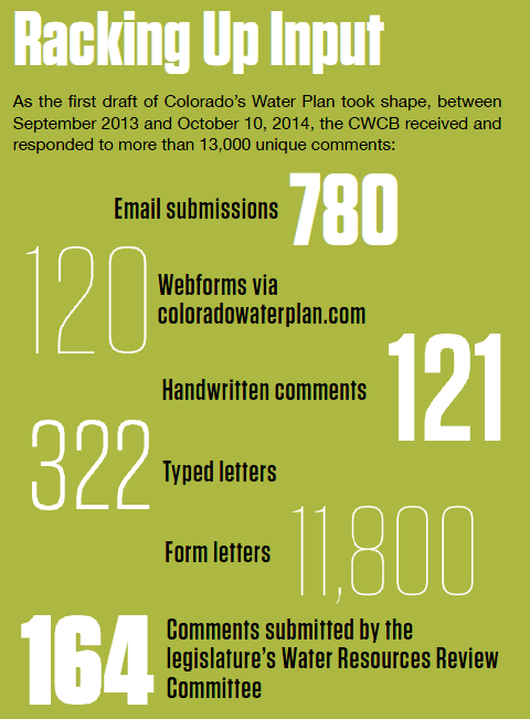 To date, the CWCB alone has met with more than 100 organizations, agencies and partners to solicit input. In its first 12 months, the coloradowaterplan.com website’s page views climbed to 18,500. As of October 2014, when the public comment period closed for the plan’s first draft, more than 13,000 individual comments on the plan had been received by the CWCB, whether delivered via the website, by mail or email, or verbally at a meeting or hearing. Every comment was acknowledged and received a response.