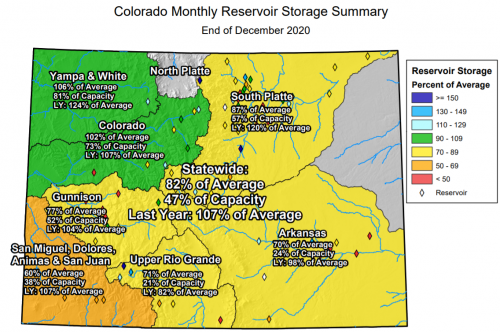 Right now snowpack statewide is at 78 percent of normal, according to the Natural Resources Conservation Service, and stored water supplies are also below average. Last year reservoirs stood at 107 percent of average at this time, but are now at just 82 percent of average.