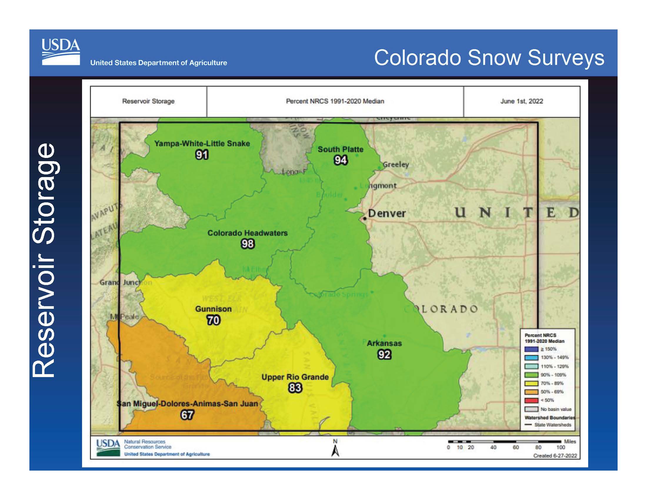 Colorado derives the majority of its drinking and farm water supplies from mountain snows that are collected in reservoirs, and as a result, reservoir levels are closely watched.