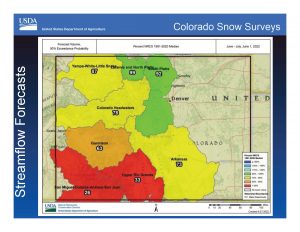 At the same time, the drought continues to sap Colorado’s rivers. Statewide stream flows are expected to hit just 69% of average. And in the picture in the dry southwest corner of the state is grim, with the San Juan Basin expected to see stream flows of just 26% of normal, while the Rio Grande Basin streams are expected to hit 33% of average, according to the NRCS.