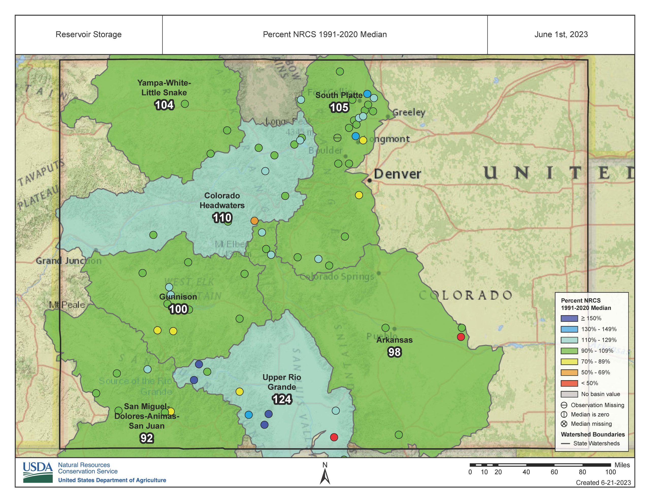 Thanks to heavy winter snows and a rainy spring, Colorado’s system of water reservoirs hit 100% of normal this month, the fullest they’ve been in three years, according to the Natural Resources Conservation Service (NRCS).