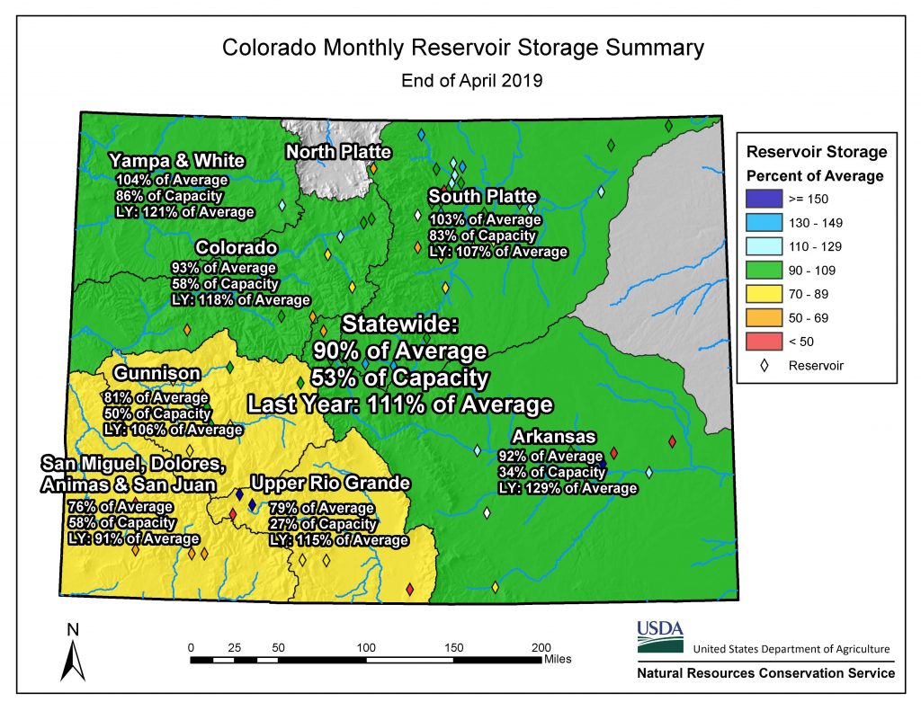 Colorado is officially drought free this month, but the state’s reservoirs are still struggling to recover, with statewide storage registering just 90 percent of average, well below the 111 percent mark it registered last year on April 30.