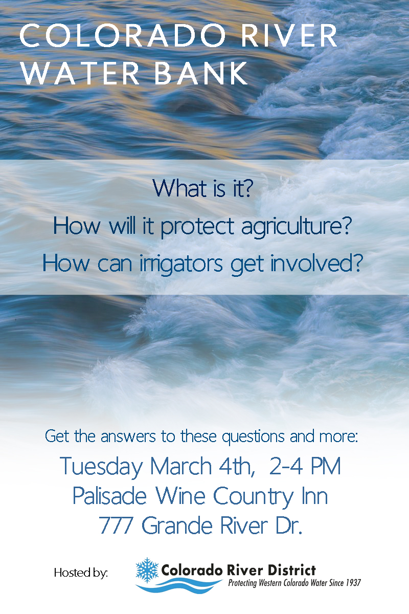The Colorado River Water Conservation District invites farmers, ranchers, and others interested in agricultural water use to a Colorado River Water Bank Ag Forum on Tuesday, March 4th. The forum will be an opportunity for irrigators to learn about the water bank concept, ask questions, and share their thoughts. Irrigators’ input early on in the process is critical to evaluating the feasibility of the project.