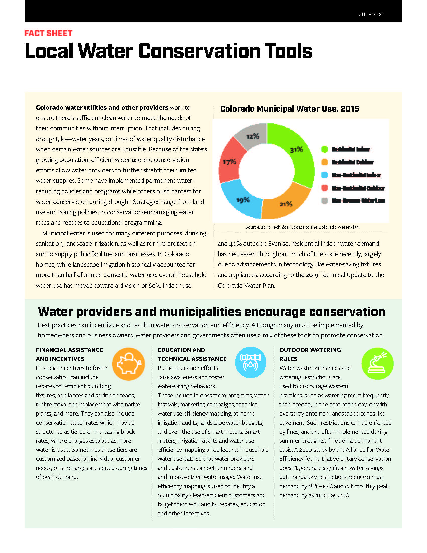 Landscaping accounts for a good portion of water use—according to the 2019 Technical Update to the Colorado Water Plan, an average of about 38% of municipal water use in Colorado goes to meet outdoor residential and non-residential demands. Creating a landscape or xeriscape specifically for Colorado’s dry climate and educating yourself on the water needs of your plants and grasses can save you thousands of gallons of water each year.