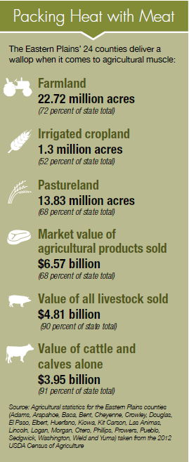 The end products of the region’s livestock industryare sold all over the United States and beyond, with Colorado ranking as the country’s fourth-largest beef exporter. According to the U.S. Department of Agriculture’s agricultural census, the total value of all the livestock, poultry and related products in Colorado’s 24 Eastern Plains counties topped $4.8 billion in 2012. “People need to realize that life doesn’t end 100 miles from the Front Range,” says Richard Holtorf, a rancher in Akron.