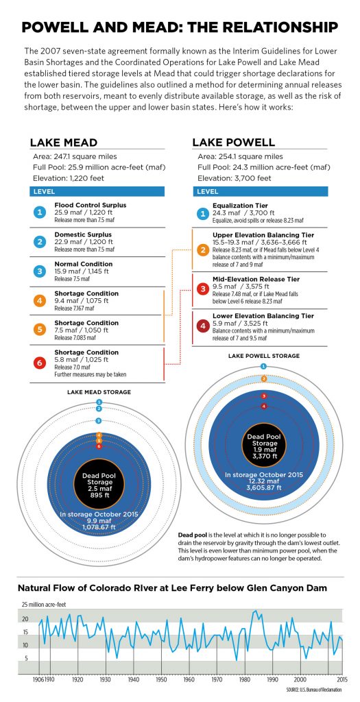 Several steps have been taken to help the states cope with rising anxiety over the declines in these massive storage pools, most notably the Interim Guidelines finalized in 2007. And it is those guidelines that dictate the shortages the lower basin states may soon begin to absorb, if the surface elevation of Lake Mead threatens to fall below 1,075 feet above sea level at the outset of 2017.