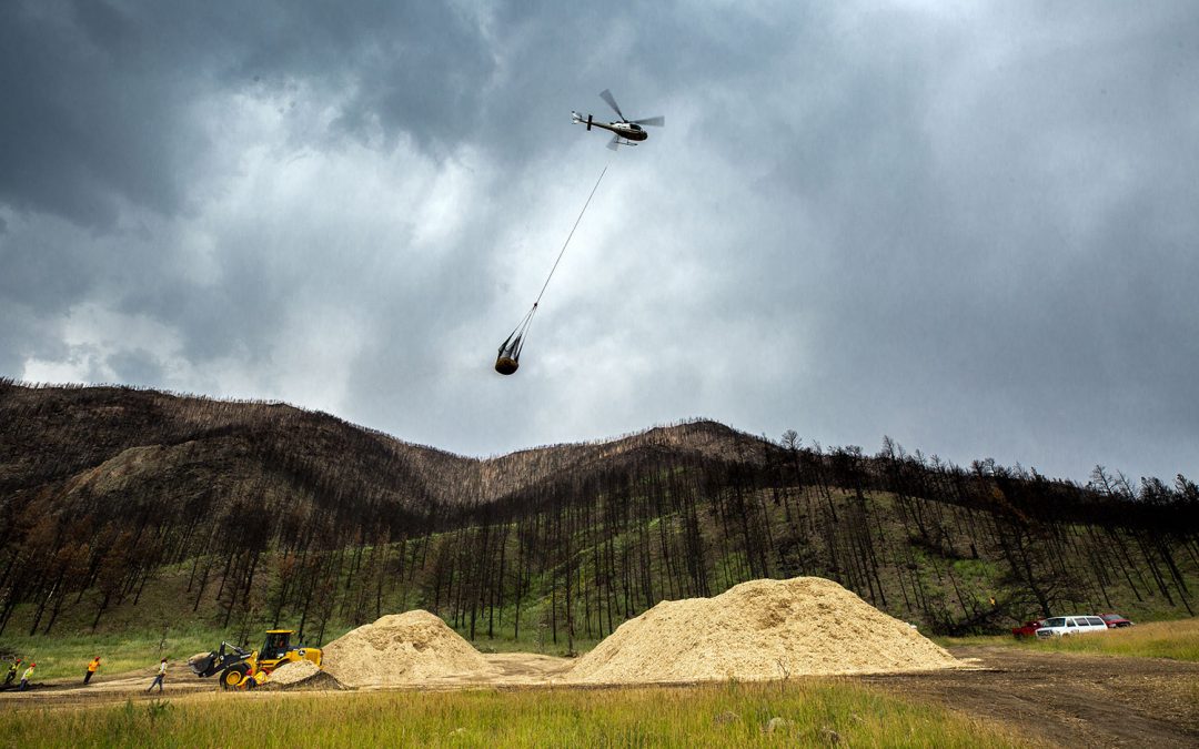 Teams of sawyers felled trees and tethered them to helicopters, which flew their cargo to a separate staging area where the wood was mulched and scooped by the half-ton into huge nets. More helicopters carried mulch loads back to the scorched CalWood hillsides to be spread atop ash and soil to hold it in place. Every rainless day was a boon to the effort to mitigate impacts from the previous fire season, buying valuable time for the teams at CalWood and other Colorado locations affected by 2020’s record-setting wildfires to prepare and stabilize soils before the late-summer monsoons hit.
