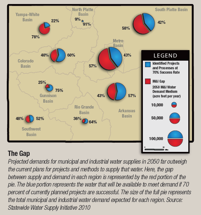 Those numbers aren’t static. The most recent Statewide Water Supply Initiative report (SWSI 2010), published by the Colorado Water Conservation Board (CWCB), forecasts that an additional 600,000 to 1 million acre feet of water will be needed by 2050 for cities and industries if Colorado’s population grows as projected, nearly doubling to between 8.6 and 10 million people. Demands stemming from the growing population could likewise double the share of the state’s water going to municipal water use—at a cost to other current uses.
