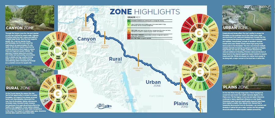 For a more accessible version of the report, the city created an online mapping tool and the Poudre River report card—a printed summary, distributed to stakeholders collaborating on river management. All three were released in May 2017. As the name implies, information in the report card is conveyed through grades—A, B, C, D and F.