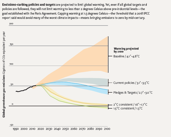 The Intergovernmental Panel on Climate Change (IPCC) issued a dire report in October 2018 concluding that even if every nation met their current Paris pledge—most have fallen far behind on their goal—the Earth will still warm by more than 3 degrees Celsius (5.4 degrees Fahrenheit) by the end of this century. The report declared that at our current rate of emissions, we can expect to see 1.5 degrees Celsius (2.7 degrees Fahrenheit) of warming as early as 2030. Based on that outlook, the Paris Agreement, once seen as a framework to inspire joint international action over time, would likely prove inadequate without sudden and sincere action by all major greenhouse gas emitters. According to a 2018 report by Yale and the New Climate Institute, Global Climate Action From Cities, Regions, and Businesses, even local action is unlikely to make up the gap. The report’s evaluation of climate change pledges from nearly 6,000 cities, states and regions around the world found that, even if targets were met they would fall significantly short of catastrophic warming thresholds.
