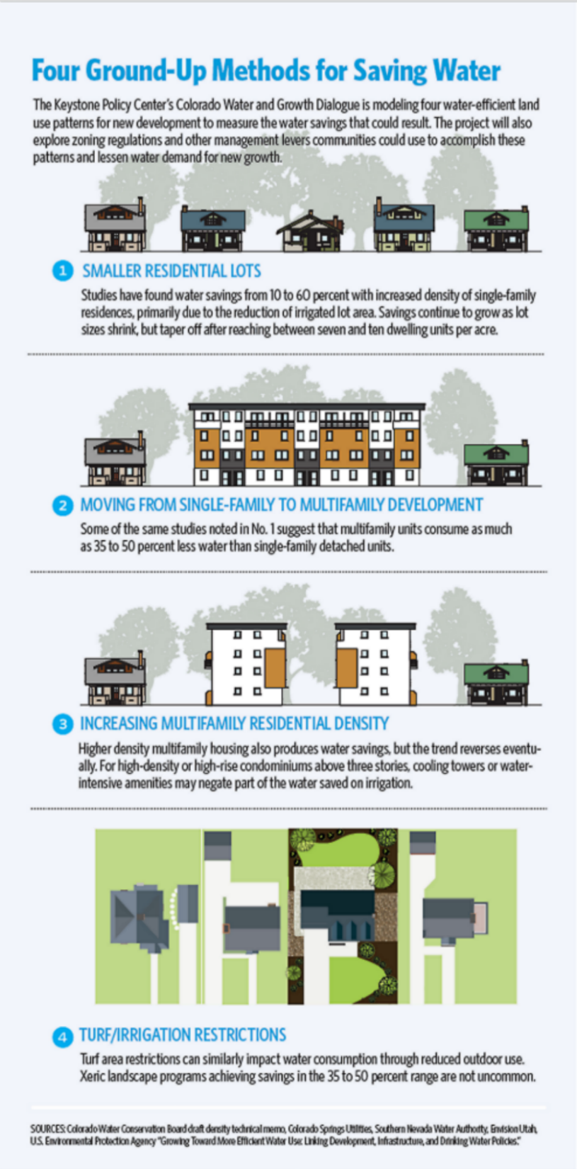 The Keystone Policy Center is also trying to move the conversation along through its Colorado Water and Growth Dialogue. Since early 2014, the dialogue has convened meetings of 25 individuals from the land and water planning fields as well as economic development organizations. Their charge is to identify land use patterns and incentives that will save water and still deliver housing products that consumers find attractive, says the Keystone Center’s Matthew Mulica, who is leading the effort. Using customer data from Denver Water and Aurora Water overlaid with the Denver Regional Council of Governments UrbanSim forecasting tool, the Keystone Center is working to conduct model runs looking at the water demand reductions that could be achieved through various land use strategies. Alternate scenarios such as climate change impacts will be layered on as the project unfolds. Having actual, comparable data about growth and its water use implications could help overcome some of the disconnect between water providers and planning departments.