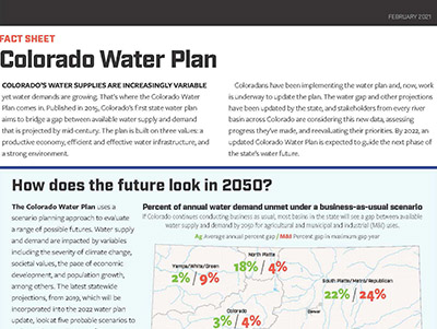 In 2023, the CWCB finalized an update to the Colorado Water Plan. The state’s first-ever water plan was published in 2015 and CWCB takes lead responsibility for updating and implementing it.